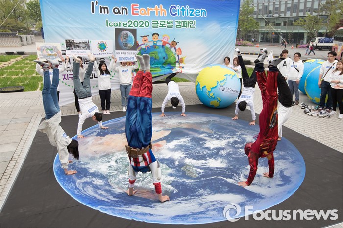 (서울=포커스뉴스) 22일 서울 종로구 광화문시민열린마당에서 지구시민운동연합 회원들이 제46회 지구의 날을 기념해 '나는 지구시민입니다'라는 주제로 플래시몹을 하고 있다.