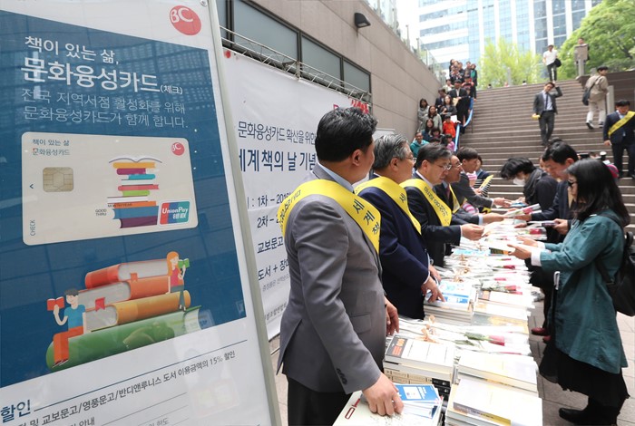 이날 윤태용 문체부 문화콘텐츠산업실장과 박대춘 서점조합연합회장 등 주요 내빈들이 시민들에게 책과 함께 문화융성카드 홍보물 및 장미꽃을 나누어 주고 있다. 이번 행사는 출판산업의 진흥을 기원하고 올해 출시된 문화융성카드를 널리 알려 지역중소서점에 도움을 주기 위해 문체부가 한국서점조합연합회와 교보문고, 비시(BC)카드, 한국출판문화산업진흥원과 함께 마련했다. <사진제공=문화체육관광부>