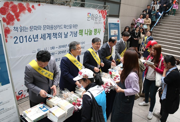 이날 윤태용 문체부 문화콘텐츠산업실장과 박대춘 서점조합연합회장 등 주요 내빈들이 시민들에게 책과 함께 문화융성카드 홍보물 및 장미꽃을 나누어 주고 있다. 이번 행사는 출판산업의 진흥을 기원하고 올해 출시된 문화융성카드를 널리 알려 지역중소서점에 도움을 주기 위해 문체부가 한국서점조합연합회와 교보문고, 비시(BC)카드, 한국출판문화산업진흥원과 함께 마련했다. <사진제공=문화체육관광부>