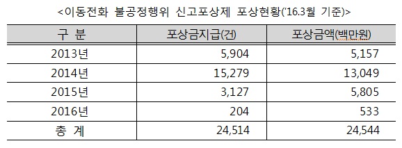 한국정보통신진흥협회(KAIT)와 SK텔레콤, KT, LG유플러스 등 이동통신 3사가 2013년 1월부터 시작된 신고포상제의 포상건수를 집계한 결과 2016년 3월 현재 2만4514건에 245억4400만원을 포상한 것으로 나타났다.