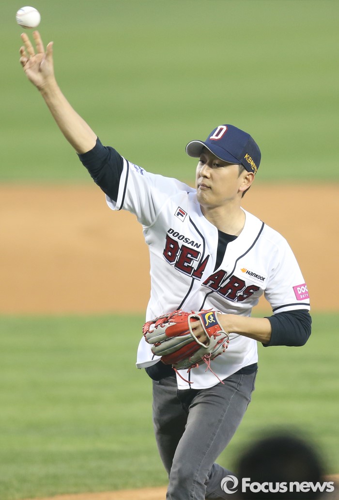 (서울=포커스뉴스) 22일 서울 잠실구장에서 열린 2016 프로야구 한화-두산 경기에 앞서 인기 아나운서 한석준이 시구하고 있다.