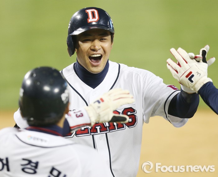 (서울=포커스뉴스) 22일 서울 잠실구장에서 열린 2016 프로야구 한화-두산 경기 7회말 1사후 두산 에반스의 대타로 나온 김재환이 한화 투수 이재우의 초구에 우월 만루 홈런을 치고 홈인하며 환호하고 있다.
