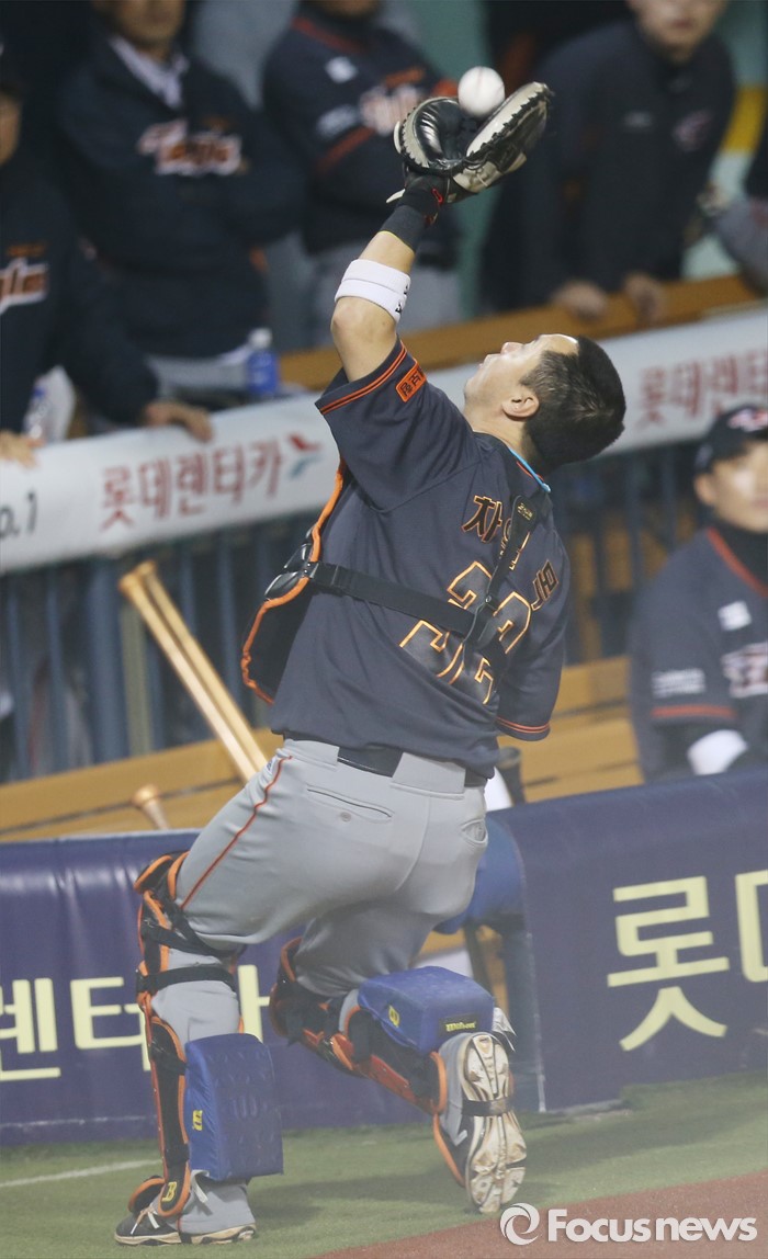 덕아웃 앞에서 뜬공 잡는 포수 차일목