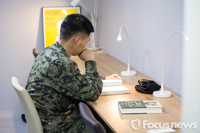 (서울=포커스뉴스) 세계 책의 날을 하루 앞둔 22일 오후 서울 중구 태평로 청계광장에서 열린 2016 세계 책의 날 기념 '두근두근 책 속으로' 책드림 날 행사에 참가한 한 군인이 병영독서카페 부스에서 독서를 하고 있다.