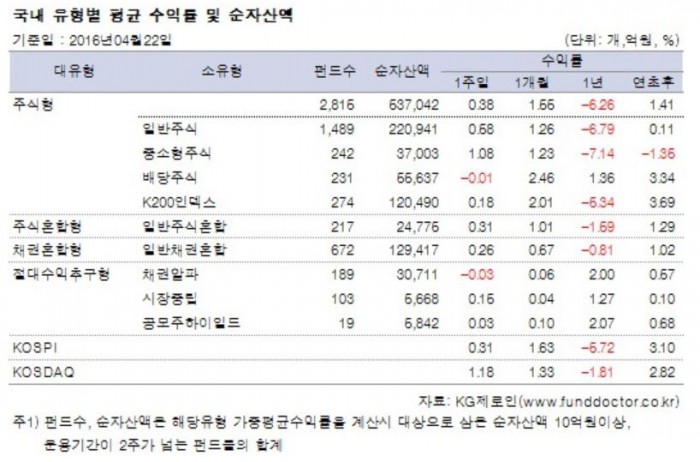 24일 펀드평가사 KG제로인이 지난 22일 공시된 기준 가격으로 펀드 수익률을 조사한 결과, 전체 국내 주식형펀드는 한 주간 0.38% 상승했다.