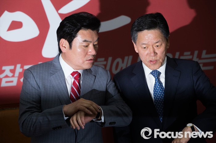 (서울=포커스뉴스) 원유철 새누리당 원내대표와 주승용 국민의당 원내대표가 24일 오후 서울 여의도 국회에서 열린 3당 원내대표 회동에서 이종걸 더불어민주당 원내대표를 기다리며 시간을 확인하고 있다.