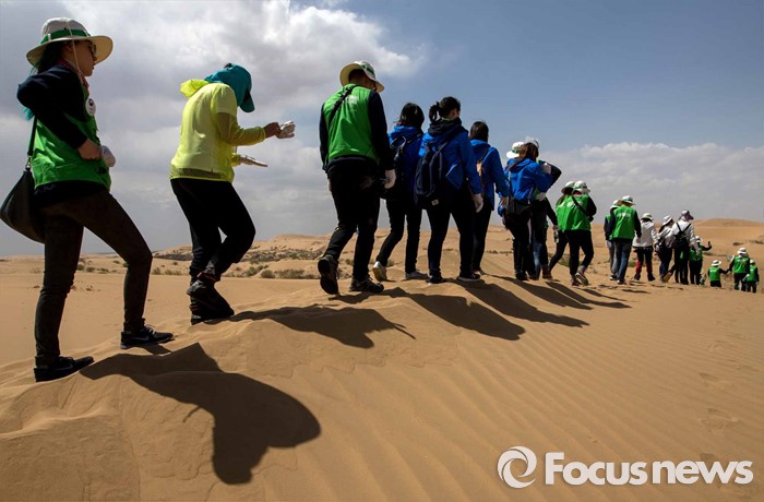 (다라더치/중국=포커스뉴스) 24일 오전 중국 내몽고 다라더치 쿠부치사막에서 한ㆍ중ㆍ일 대학생들로 구성된 2016 미래숲 15기 녹색봉사단원들이 사막트래킹을 하고 있다. 미래숲 녹색봉사단은 이번 봉사활동을 통해 황폐화된 사막에 나무 심기 및 각국 청년들과 우호를 증진을 위한 교류 활동을 전개할 예정이다.