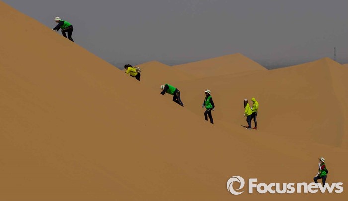 (다라더치/중국=포커스뉴스) 24일 오전 중국 내몽고 다라더치 쿠부치사막에서 한ㆍ중ㆍ일 대학생들로 구성된 2016 미래숲 15기 녹색봉사단원들이 사막트래킹을 하고 있다. 미래숲 녹색봉사단은 이번 봉사활동을 통해 황폐화된 사막에 나무 심기 및 각국 청년들과 우호를 증진을 위한 교류 활동을 전개할 예정이다.