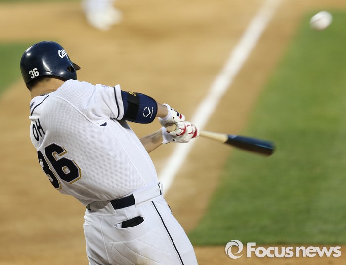 (서울=포커스뉴스) 24일 서울 잠실구장에서 열린 2016 프로야구 한화-두산 경기 6회말 2사 만루에서 두산 오재일이 좌중간 2타점 안타를 치고 있다.