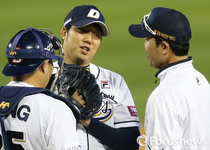 (서울=포커스뉴스) 24일 서울 잠실구장에서 열린 2016 프로야구 한화-두산 경기에서 두산 선발투수 장원준이 7회 1사후 주자를 내보내고 마운드에 올라간 한용덕 코치와 얘기하고 있다.