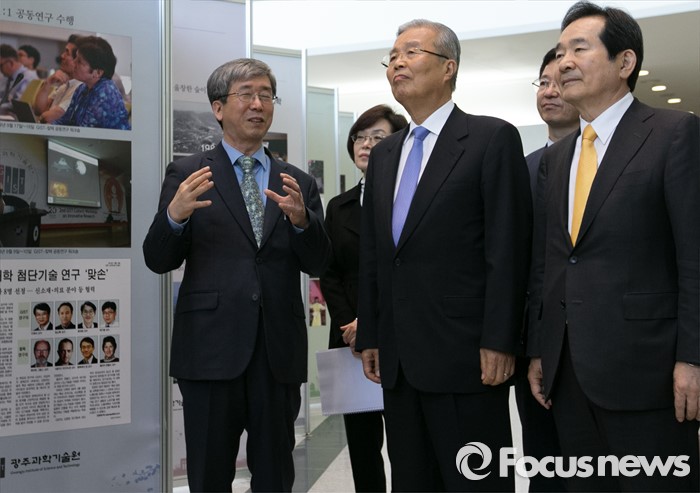 (광주=포커스뉴스) 김종인(가운데) 더불어민주당 비대위 대표 등 의원들이 25일 오후 광주과학기술원(GIST, 지스트)을 방문해 문승현(왼쪽) 총장으로부터 설명을 듣고 있다. 오른쪽은 정세균 의원.