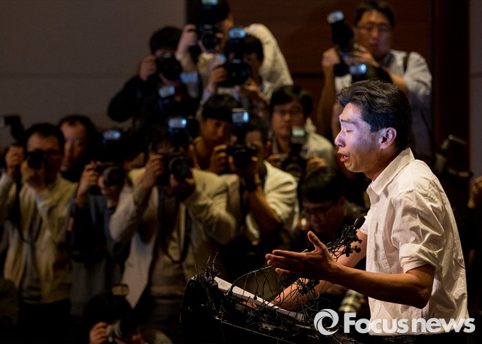 (서울=포커스뉴스) 2일 오전 서울 영등포구 콘래드호텔에서 열린 '옥시레킷벤키저(현 RB코리아) 가습기 살균제 파동' 관련 기자회견에서 가습기 살균기 피해자 연대의 최승운 씨가 항의발언을 하고 있다.