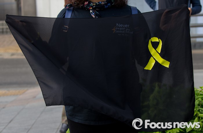 (서울=포커스뉴스) 근로자의날을 맞은 1일 오후 서울 종로 일대에서 민주노총 주최로 열린 '2016 세계노동절대회'에 참가한 4.16 유가족 및 관계자들이 노란 리본이 그려진 검은 천을 들고 있다.