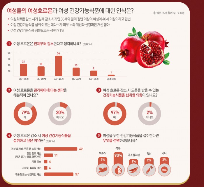 또, 이번 설문에서 여성이 선호하는 건강기능식품 성분으로는 백수오(3%)와 홍삼(2%)을 제치고 석류가 90%를 차지해 눈길을 끌었다.