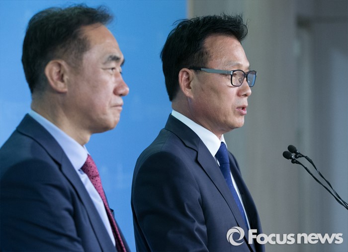 (서울=포커스뉴스) 정장선(왼쪽) 더불어민주당 총무본부장과 박광온 대변인이 27일 오전 서울 여의도 국회 정론관에서 전당대회 일정 등과 관련 브리핑을 하고 있다.