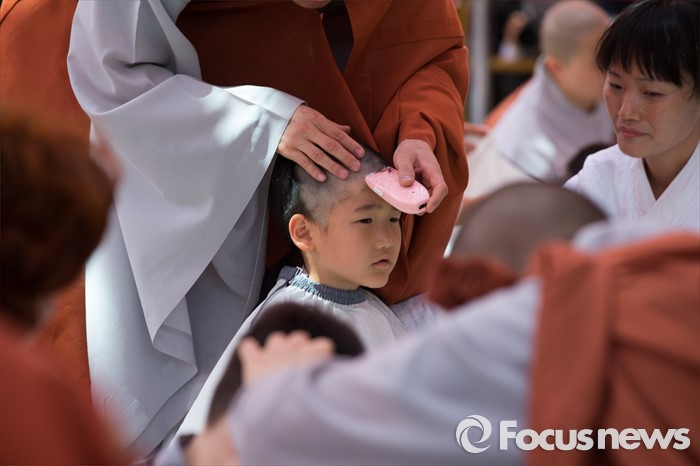 (서울=포커스뉴스) 2일 오전 서울 종로구 조계사 대웅전 앞마당에서 열린 동자승 단기출가 보리수 새싹학교 삭발, 수계식에서 동자승들이 삭발을 하고 있다.