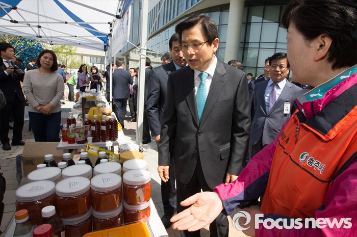 (세종=포커스뉴스) 황교안 국무총리가 26일 오전 세종시 정부세종청사 국토교통부 내 광장에서 열린 국무총리실과 1사 1촌 자매결연을 맺은 충주 재오개마을 농·특산물 직거래 장터에 방문해 농산물과 특산물을 살피고 있다.