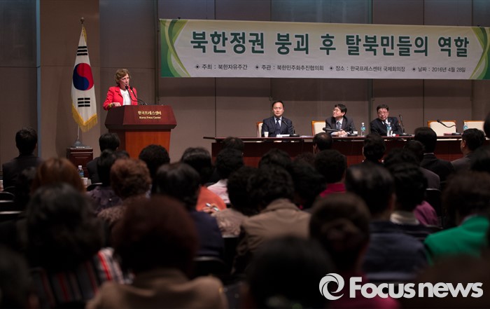 (서울=포커스뉴스) 28일 오후 서울 중구 프레스센터에서 북한정권 붕괴 후 탈북민들의 역할 대토론회에 참석한 수잔 숄티 디펜스포럼 대표가 주제발표를 하고 있다.