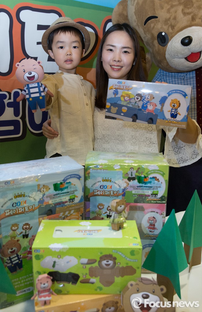 코디 페이퍼토이 미용티슈는 상자 표면에 입체 곰돌이를 만들 수 있는 전개도가 프린트 되어 있어 다 쓴 미용티슈를 활용해 아이들이 페이퍼토이를 만들 수 있는 제품이다.