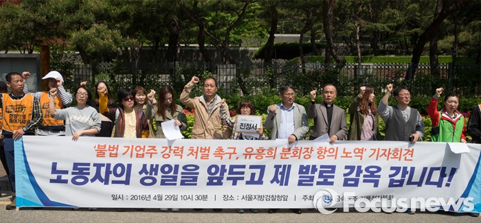 (서울=포커스뉴스) 29일 오전 서울 서초구 서울중앙지검 앞에서 열린 '불법 기업주 강력 처벌 촉구, 유흥희 분회장 항의 노역' 기자회견 참석자들이 관련 구호를 외치고 있다.