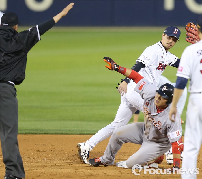 (서울=포커스뉴스) 26일 서울 잠실구장에서 열린 2016 프로야구 SK-두산 경기 3회초 1사후 SK 최승준이 두산 2루수 오재원의 글로브 맞고 빠지는 안타를 치고 2루까지 뛰어 세이프되고 있다.