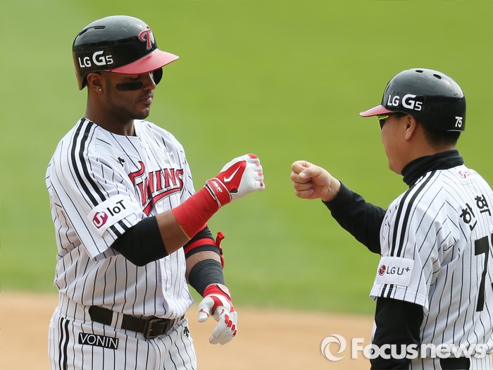 (서울=포커스뉴스) 1일 서울 잠실구장에서 열린 2016 프로야구 kt-LG 경기 3회말 1사 3루에서 LG 히메네스가 주자를 불러 들이는 중전 안타를 치고 1루에서 한혁수 코치와 주먹을 마주치고 닜다.