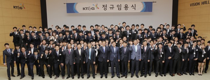 KT&G 관계자는 "KT&G는 최근 기업들의 신규채용이 감소하고 청년 실업률이 심각한 상황에서 다양한 방법의 일자리 나눔을 통해 상생을 추구하고 있다"며 "앞으로도 신규채용을 지속적으로 확대해 청년 고용 창출에 이바지할 것"이라고 밝혔다.KT&G 인재개발원에서 개최된 'KT&G 신입사원 정규 임용식'에서 백복인 KT&G 사장(앞줄 왼쪽 10번째)을 비롯 임원들과 신입사원들이 기념촬영하고 있다.<사진제공=KT&G>