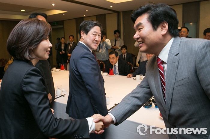 (서울=포커스뉴스) 원유철(오른쪽) 새누리당 원내대표와 나경원 의원이 25일 오후 서울 여의도의 한 중식당에서 열린 중진의원 오찬 간담회에 참석해 악수하고 있다.