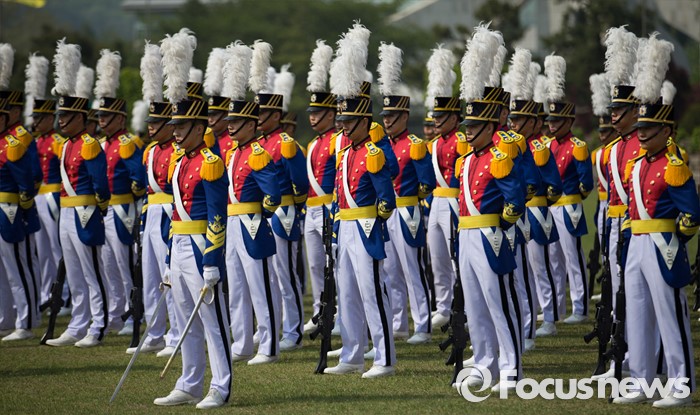 (서울=포커스뉴스) 29일 오후 서울 노원구 육군사관학교에서 열린 개교 70주년 기념식에서 생도들이 도열하고 있다.