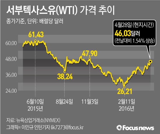 (서울=포커스뉴스) 28일(현지시간) 뉴욕상업거래소(NYMEX)에서 서부텍사스산원유(WTI) 가격은 전날보다 배럴당 0.7달러(1.5%) 오른 46.03달러를 기록했다.