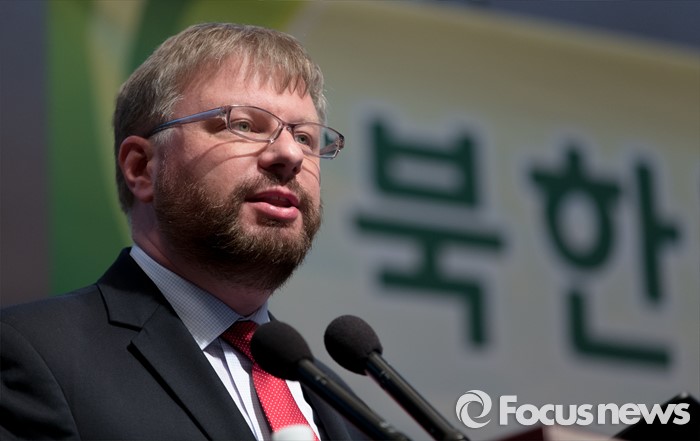 (서울=포커스뉴스) 28일 오후 서울 중구 프레스센터에서 북한정권 붕괴 후 탈북민들의 역할 대토론회에 참석한 그렉 스칼라튜 미국 북한인권위원회 사무총장이 인사말과 기념사를 하고 있다.