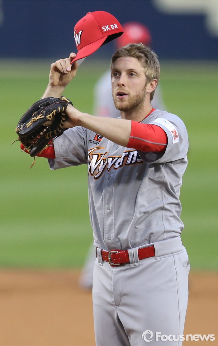 (서울=포커스뉴스) 26일 서울 잠실구장에서 열린 2016 프로야구 SK-두산 경기에서 1회말 SK 선발투수 켈리가 주심에게서 볼을 받고 있다.