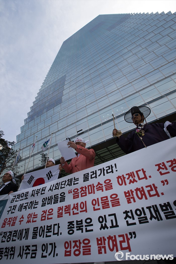 (서울=포커스뉴스) 26일 오후 서울 영등포구 전경련회관 앞에서 애국국민운동대연합 회원들이 어버이연합 억대 금품지원 규탄 기자회견을 하고 있다.