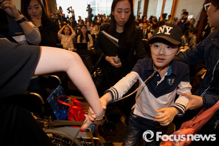 (서울=포커스뉴스) 2일 오전 서울 영등포구 콘래드호텔에서 열린 '옥시레킷벤키저(현 RB코리아) 가습기 살균제 파동' 관련 기자회견에 피해자 임성준 군이 입장하고 있다.