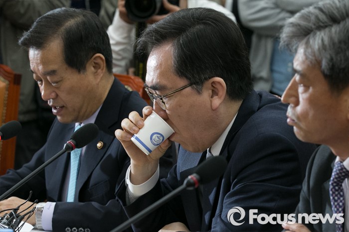 (서울=포커스뉴스) 조태열(가운데) 외교부 제2차관이 28일 오전 서울 여의도 국회에서 열린 대북 관련 긴급 안보 대책회의에 참석해, 물을 마시고 있다.