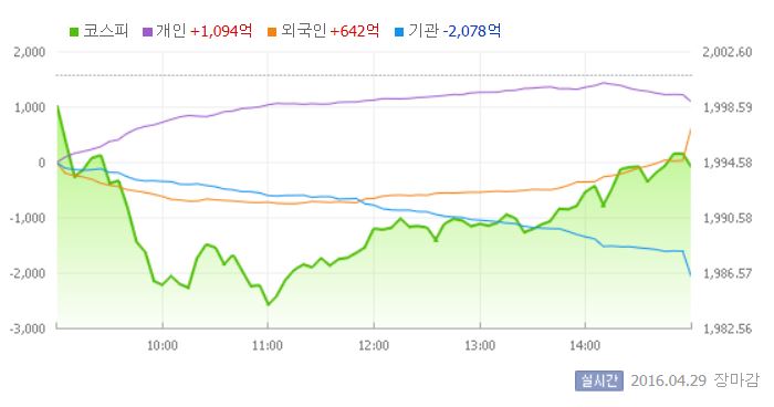 이날 코스피는 전일 대비 0.11% 하락한 1998.68로 장을 시작했다. 이후 지수는 기관의 대규모 매도세에 하락 폭을 확대했다.