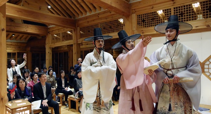 (서울=포커스뉴스) 문화체육관광부 해외문화홍보원(원장 김갑수)이 주한 외국인을 대상으로 한국문화를 소개하는 문화공감 콘서트 '헬로, 미스터 케이!(Hello, Mr. K!)’가 27일 성북구가구박물관에서 열렸다. 이날 콘서트에 참석한 주한 외국대사 및 직원, 외신 기자들이 조선시대 선비 생활상을 조명한 한복 패션쇼를 보고 있다. <사진제공=문화체육관광부>