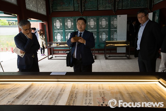 (서울=포커스뉴스) 27일 오후 서울 종로구 경복궁 집옥재에서 시민들이 박세당의 장원급제 답안지를 보고 있다.