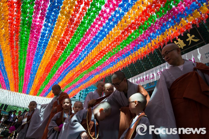(서울=포커스뉴스) 2일 오전 서울 종로구 조계사 대웅전 앞마당에서 열린 동자승 단기출가 보리수 새싹학교 삭발, 수계식에서 동자승들이 모든 일정을 마치고 연등아래 스님들과 함께 하고 있다.