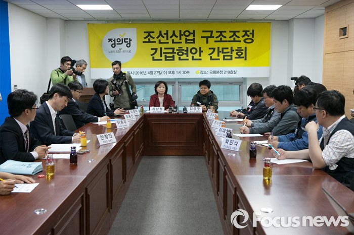 (서울=포커스뉴스) 심상정(정면 왼쪽) 정의당 대표가 27일 오후 서울 여의도 국회 의원회관에서 조선업종 구조조정 긴급현안 간담회에 참석해, 김상구(정면 오른쪽) 민주노총 금속노조 위원장의 모두발언을 경청하고 있다.