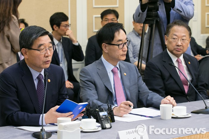 (서울=포커스뉴스) 이기권(왼쪽) 고용노동부 장관이 27일 오전 서울 여의도 국회 귀빈식당에서 열린 청년 · 여성 일자리대책 당정협의에 참석해, 발언하고 있다. 왼쪽부터 이 장관, 이준식 사회부총리, 유일호 경제부총리.
