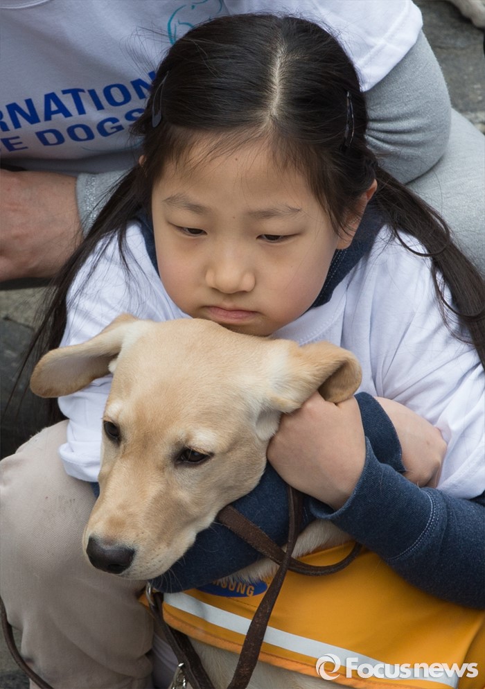 (서울=포커스뉴스) 27일 오전 서울 청계천에서 삼성화재안내견학교 훈련사들과 안내견들이 시민들과 함께 '안내견과의 만남' 행사를 하고 있다.