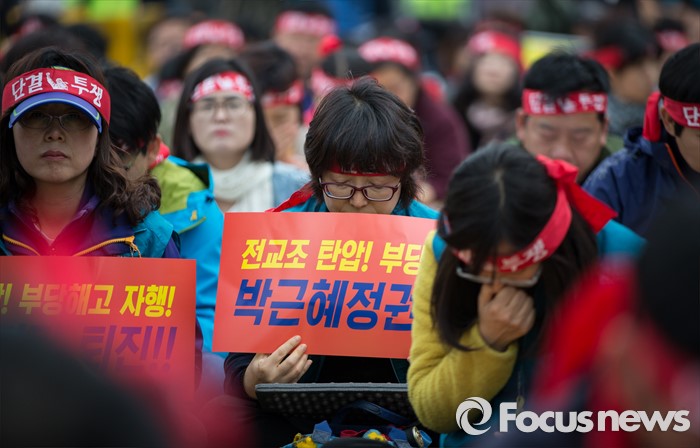(서울=포커스뉴스) 27일 오후 서울 종로구 정부종합청사 앞에서 전교조(전국교직원노동조합)와 민주교육과 전교조 지키기 전국행동의 주최로 법외노조 후속조치 규탄 및 부당해고 저지, 노동기본권 쟁취를 위한 집회가 열리고 있다.