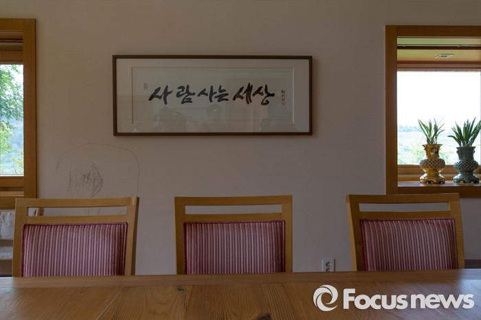 (김해=포커스뉴스) 고 노무현 전 대통령 서거 7주기를 앞두고 1일 오전 노 전 대통령의 사저가 공개되고 있다. 사랑채 한쪽 벽면에 고 신영복 선생이 쓴 '사람사는 세상' 액자가 걸려있다.