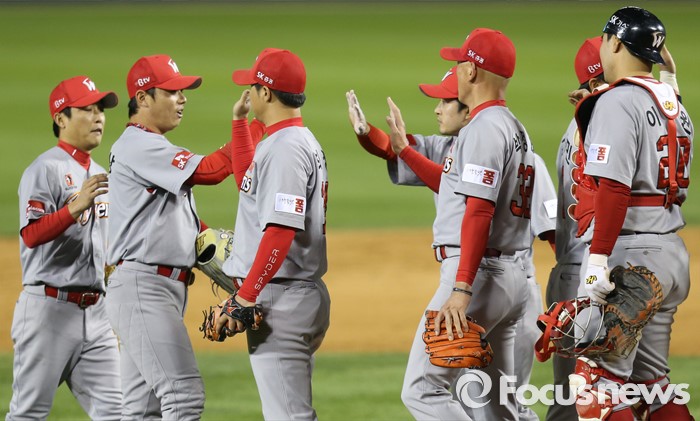 (서울=포커스뉴스) 27일 서울 잠실구장에서 열린 2016 프로야구 SK-두산 경기에서 3-1로 승리한 SK 선수들이 마운드에 모여 하이파이브를 하고 있다.