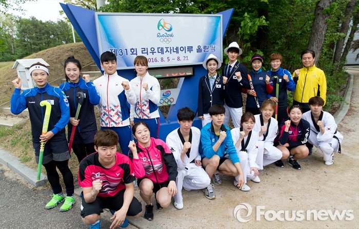 (서울=포커스뉴스) 27일 오후 서울 노원구 태릉선수촌에서 열린 제31회 리우하계올림픽대회 D-100일 미디어데이에서 국가대표 선수들이 파이팅을 외치며 기념촬영을 하고 있다.
