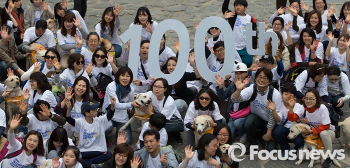 (서울=포커스뉴스) 27일 오전 서울 청계천에서 삼성화재안내견학교 훈련사들과 안내견들이 시민들과 함께 '안내견과의 만남' 행사를 하고 있다.