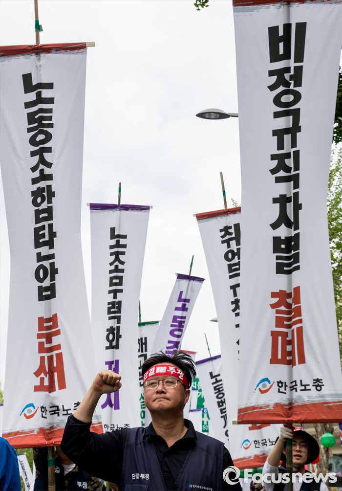 (서울=포커스뉴스) 근로자의날을 맞은 1일 오후 서울광장에서 열린 한국노총 5.1 전국노동자대회를 마친 참가자들이 종로로 행진을 이어가고 있다.