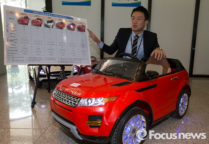 (세종=포커스뉴스) 2일 오전 세종시 정부세종청사 공정거래위원회에서 한국소비자원 관계자가 어린이 전동 승용완구 성능 및 안전성 등 제품별 차이를 설명하고 있다.