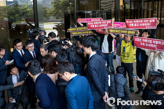 (서울=포커스뉴스) 수 많은 목숨을 앗아간 가습기 살균제가 만들어졌을 당시 옥시 최고경영자를 지낸 신현우 전 옥시 대표가 26일 오전 서울 서초구 서울중앙지검에 피의자 신분으로 출석 하고 있다.